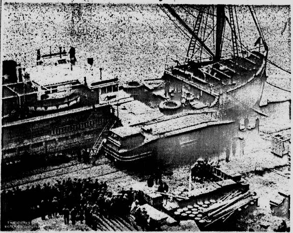 By a Staff Photographer Huge Machine Awaits Go Sign to South Pole Specially designed tractor of Byrd Antarctic Expedition on Boston pier beside steamer North Star, which is due to sail tomorrow |