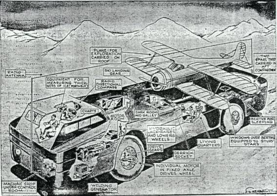 Ten feet of her tail removed, the Byrd snow cruiser, which spent the night of November 1 in Bucyrus, was finally loaded aboard the steamer North Star at Boston today and made ready for its long journey to the Antarctic, where it will be used by Rear Admiral Richard E. Byrd in his new South Pole adventure. The above picture above the "innards" of the giant cruiser. The rear section marked for spare tires is the part that was removed in order to get the cumbersome vehicle aboard the ship. |