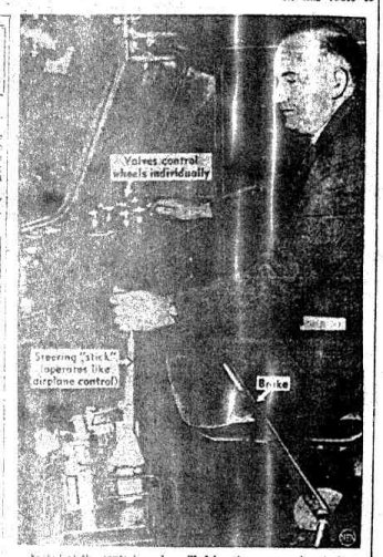 Seated at the controls as he will drive the snow cruiser to Boston and later in the Antarctic is Dr. Thomas C. Poulter, its designer. |