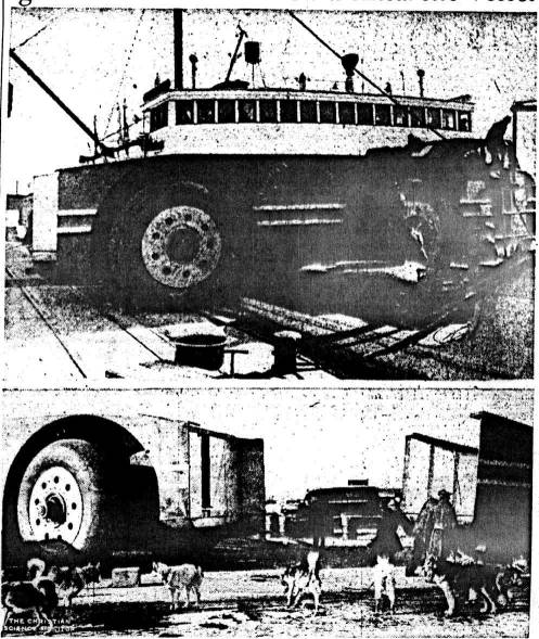 Upper: The 37-ton snow cruiser of the Byrd Antarctic Expedition, truncated by the removal of its 10-foot spare-tire rack, is shown being rolled onto the fore deck of the North Star, at the Army Pier in Boston, a few hours before the expedition vessel was scheduled to sail. Lower: The tire rack is being removed to make the big, mechanical dog sled fit on the vessel's deck. |